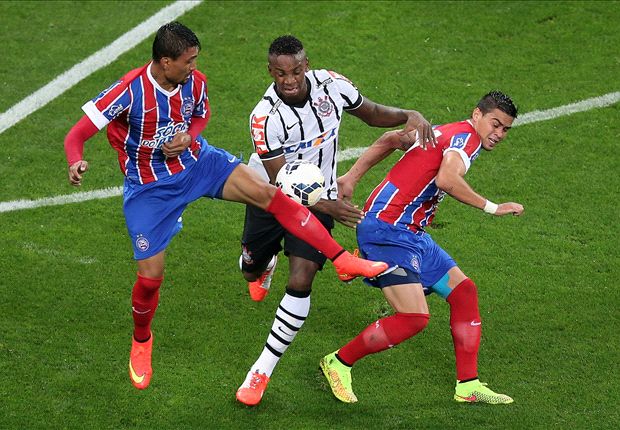 O jogo já começou lento demais na Arena Corinthians. O time da casa até tentou controlar a partida, mas o Bahia marcou bem e até trocou passes para esfriar a partida. A partida começou a esquentar por causa das jogadas aéreas. O primeiro gol do Bahia veio justamente de uma cobrança de falta lançada na área. Emanuel Biancucchi, aos 35 minutos, fez o chuveirinho. A bola passou por Cléber e foi direto na cabeça de Kieza, que só precisou desviar para abrir o placar.
